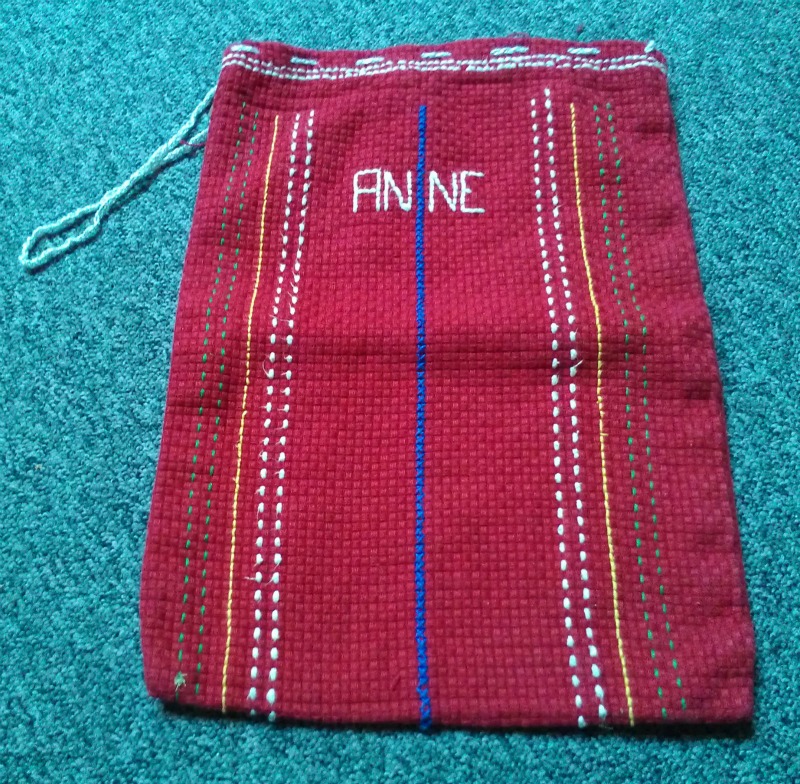 De naam (meen ik me te herinneren) en het dichtnaaien waren niet mijn verantwoordelijkheid, maar de streepjes in verschillende steken wel. En die zak heb ik jaren gebruikt.