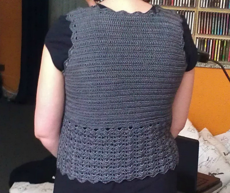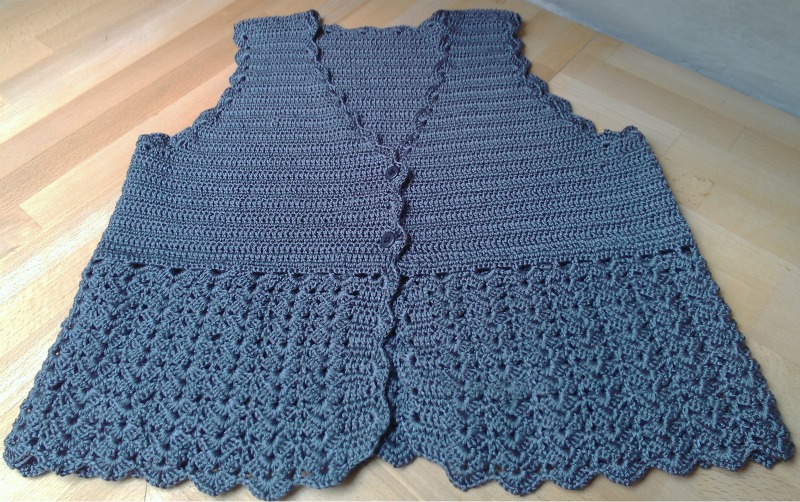 Interesse? Het patroontje vind je hier. Ik heb het vrij getrouw gevolgd, alleen bij het boordje rond het vestje heb ik mijn eigen zin gedaan. In het patroon staat om de 2cm een steek, ik heb iedere keer een steek tussengelaten, omdat ik vond dat het anders teveel ging trekken. Kan ook aan mezelf liggen, misschien is om de steek hetzelfde als 2cm tussen, en kan ik de afstand van 2cm niet goed inschatten. Who knows.
