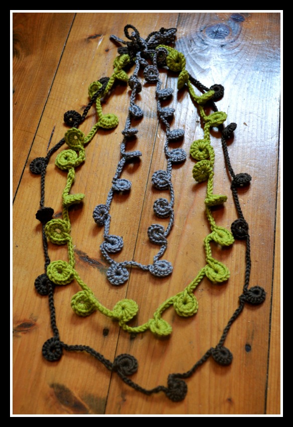 Er werd garen voorzien in kleurtjes die de jarige graag ziet, en er werden halskettinkjes gehaakt in verschillende lengtes. Makkelijk en dankbaar, want ook snel klaar.
