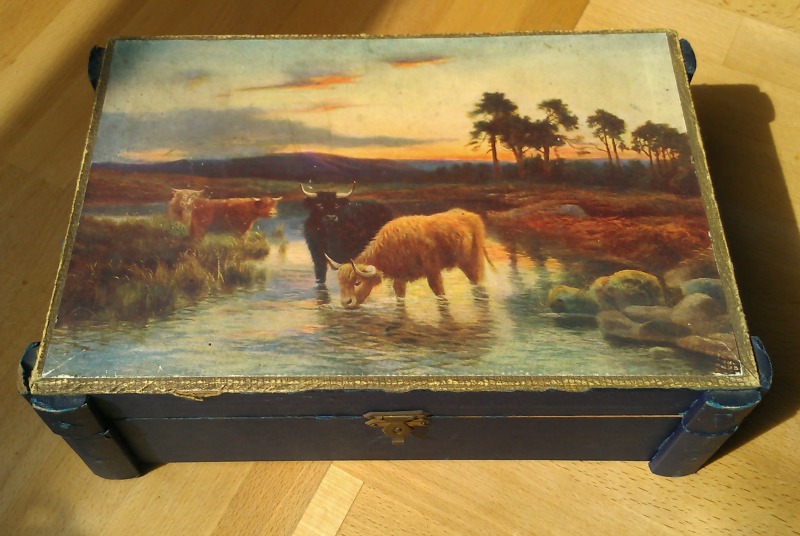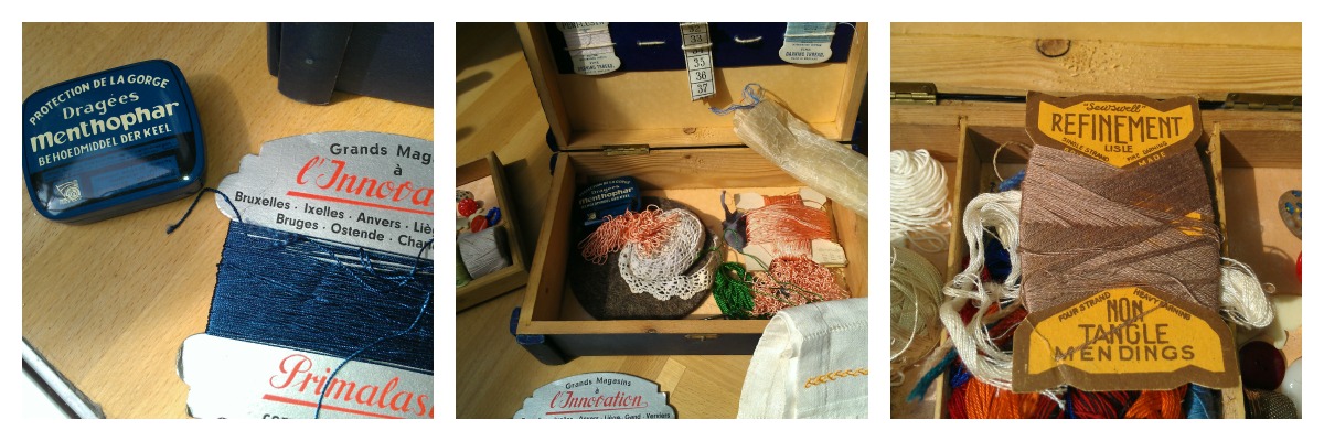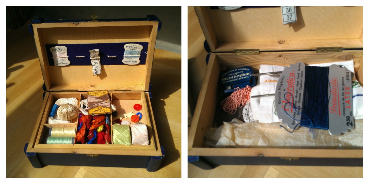 Ik had al leuke doosjes, van mijn grootouders. Nu heb ik leuke doosje van iemand anders’ grootouders, lijkt me. Haakgaren, naaigaren, haakpennen, een dikke naald, knopen, een proeflapje, een gehaakt boordje… vanalles zit er in die doos. Mooi!