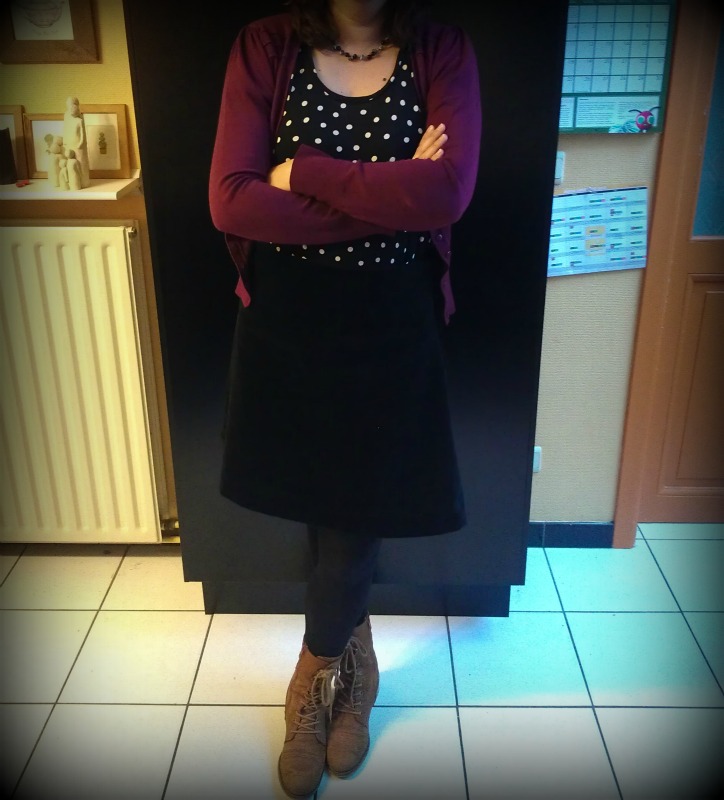 De A-lijn van Mme ZsaZsa, waar ik wat aan foefelde. Wat korter, wat smaller. Ik had alleen niet de guts om het nog smaller te maken. Had gemogen, voor dit stofje (zeg maar stof, nogal zwaar fluweelachtig). Dan had het mooier gevallen. Maar, aan de andere kant, dan zou ik er wellicht niet mee kunnen fietsen. Maar goed, ’t is goed gelukt, en de reacties waren enthousiast.
