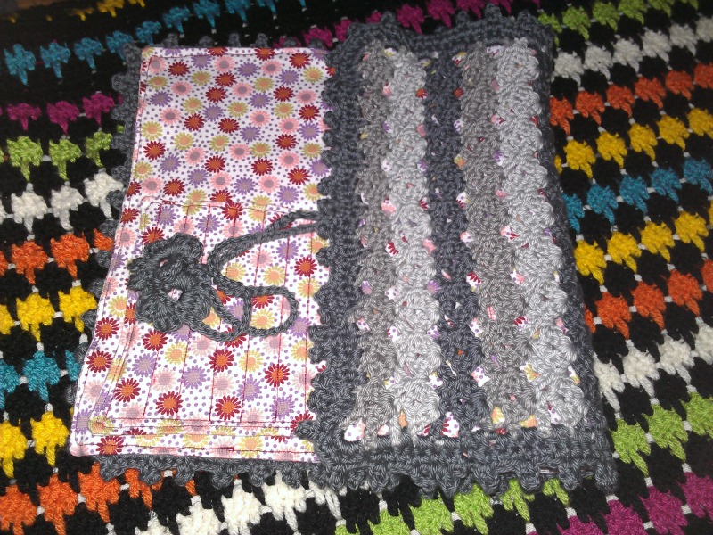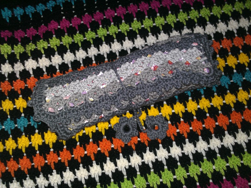 Voor het randje heb ik lang gezocht, en ben ik uiteindelijk uitgekomen bij een rij halve stokjes, en daarna een klein picootje. Daarna haakte ik er voor de sluiting twee “lintjes” aan in lossen met op het eind een bloemetje (gevonden via deze zalige verzameling bloempatronen).