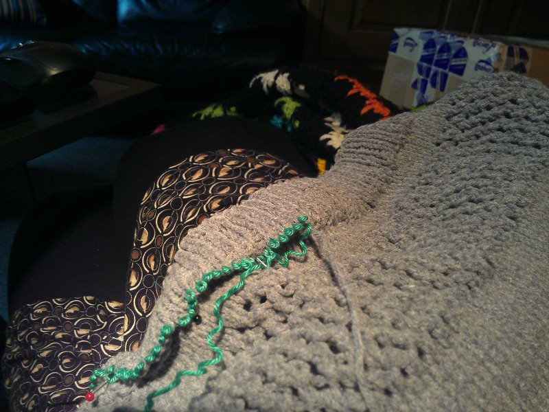 Waarna we dus begonnen aan de trui zelf. Hoeveel keer ik die herbegonnen ben, geen idee meer. Maar het was vaak. Fouten gemaakt. Steken laten vallen. Tricotsteek niet mooi genoeg naar mijn goesting. Die kantsteek, amai mijn voeten. Fouten dat ik daarin gemaakt heb, maar fouten! Moeilijk dat ik dat vond! En lastig! Want eerlijk, breien vind ik sowieso al meer belastend voor de armen dan haken, en die kantsteek was helemaal lastig. Maar goed, na een tijd was ik er toch mee weg.