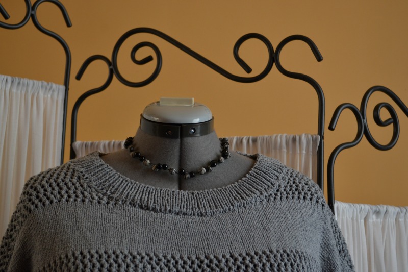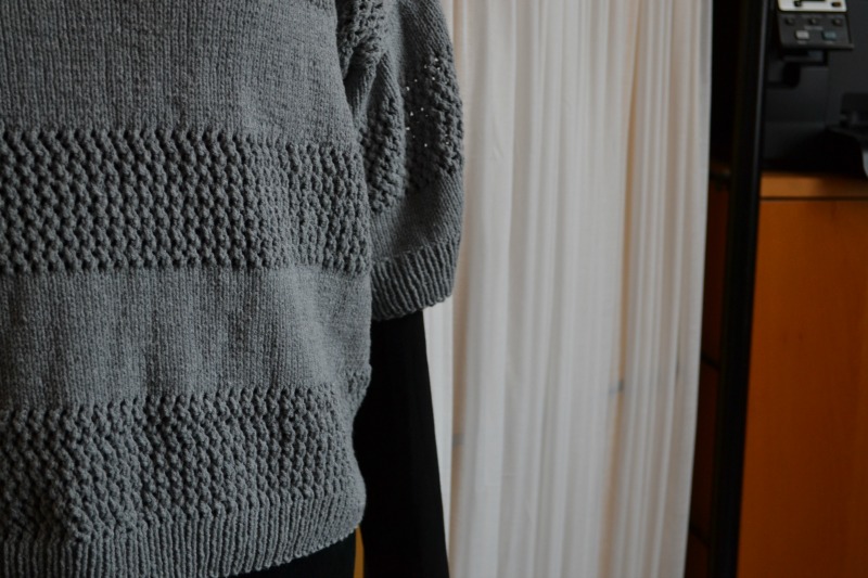 De trui heeft hier maandenlang meegegaan. Ik kon er niet aan een stuk aan voortdoen, Tussendoor haken, naaien, soms eens een paar weken volledig laten liggen… Ik denk dat ik er in april aan begonnen ben, en een paar weken geleden heb ik besloten hem dan maar eens af te werken. Mouwen gebreid, halsboord gebreid.