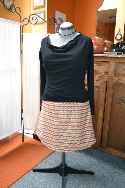 Het in elkaar steken ging vlot en op het gemakje. Het rokje was mooi gestreken, maar tegen dat het op de paspop zat, was het alweer gekreukeld. Het eraf halen, strijken en opnieuw aandoen heeft weinig zin, het rokje zou al even gekreukeld zijn. Foto’s met kreukels dus. Hier nog met een zwarte trui, aangepast shirt komt later.
