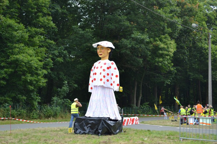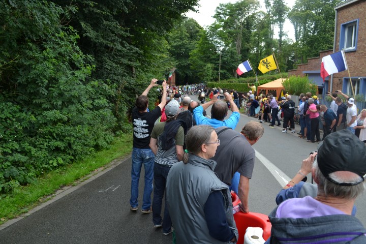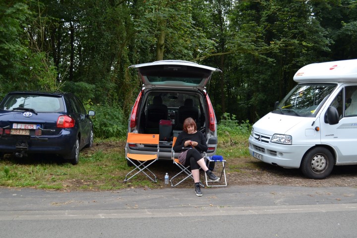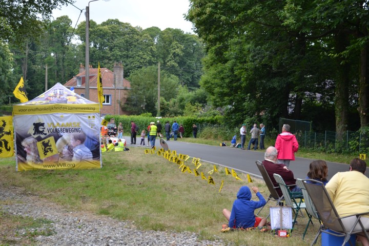 Ons stuk van de straat werd afgesloten, coureurs zullen we hier niet zien passeren. Maar we zitten op ons gemak. En op andermans gemak ook blijkbaar, want in de namiddag wordt de ruimte achter onze wagen (en nog wat anderen) populair als urinoir. Tssss. Voor ons zien we een andere urinoir ofte de recuperatie van sportevenementen door de Vlaamse beweging, als er iets is waar ik me aan erger, dan is het dit wel, het uitdelen van Vlaamsche vlagjes aan mensen die begot niet beseffen wat ze in hun pollen gedraaid krijgen. Maar goed, genoeg daarover, want ik ging me niet ergeren.