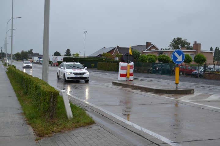Een 5-tal minuten voor we de koers ter plekke verwachtten, kropen we uit de auto. Koud, nat, paraplu’s, niet veel zicht. Geen foto’s wegens teveel regen voor de camera. Nog aan de overkant gaan staan, omdat we daar beter zouden zien.