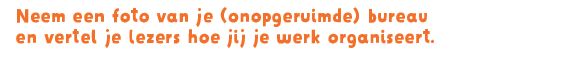 Tussen haakskes: een onopgeruimde bureau, ik ken dat niet. Terwijl ik bezig ben, is mijn bureau niet opgeruimd. Maar achteraf ruim ik altijd mijn bureau op. Ge moet dus wel niet afkomen bij mij dat rommel samengaat met een creatieve geest. Euh, don’t think so. Ik kan niet goed tegen rommel, ik word daar rusteloos en nerveus van.