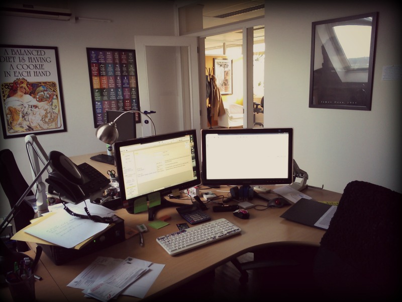 Onze bureau, gemeenzaam de “bakvissenbokaal” genoemd. Ha. Bureau waar Sophie en ik samen zitten. Mijn computer ligt plat, schoon toetsenbordje met momenteel 2 muizen (een trackball, en omdat ik die voor de moment een beetje beu ben, ook een gewone draadloze muis, jaja, met bloemekes en al, zo zijn we). Twee schermen, een gerief dat ik nooit meer zou kunnen missen.