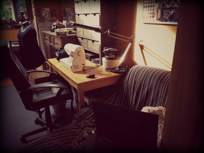 Dit is mijn bureau, heden ten dage. Mijn werk- en relaxplek. Met vooraan mijn laptop en zetel. Waar ik zit om te computeren en te breien of te haken. Daarnaast mijn bureau, met mijn naaimachine (Brother Innov-is 100). En een bureaustoel, want ik kan me niet voorstellen te moeten naaien op een gewone stoel, ik verga van de rugpijn, peins ik. Mijn muis ligt daar ook, ik vind dat gemakkelijk zo, mijn muis daar gebruiken. Maar die verhuist constant, van mijn bureau naar mijn been naar mijn zetel naar mijn tafeltje. En terug. Er ligt daar ook een vilten onderleggertje, door één van de kinderen gemaakt, om een glas of tas op te zetten. Mijn lamp, die al lichtjaren meegaat, en die veel dienst doet (ik heb licht nodig, veel licht). Daarachter een doos met rommel, daarop een mandje met mijn portefeuille, sleutels, portemonnee, bakjes van de bank, zakje met oortjes en zo, mapje met kaarten. Op mijn bureau een kastje met veel laden, waarin naaigerief (van naalden tot vulsel voor popjes) en wat techneutengerief (laders en zo). Onder het kastje nog wat dozen, de ene met veel gebruikt naaigerief (scharen, tornmesje, zoommaatje, …), de andere met mijn kamsnapstang. Achteraan in beeld ligt nog een fototoesteltas die daar normaal gezien niet ligt. Half onder mijn bureau en naast mijn bureaustoel staat een oude naaidoos, nog van Herman zijn moeder als ik me dat goed herinner, met meer naaigerief (garen, spelden en speldenkussens…) en breigerief (breinaalden vooral). Mens, wat heeft een mens naaigerief, blijkbaar.