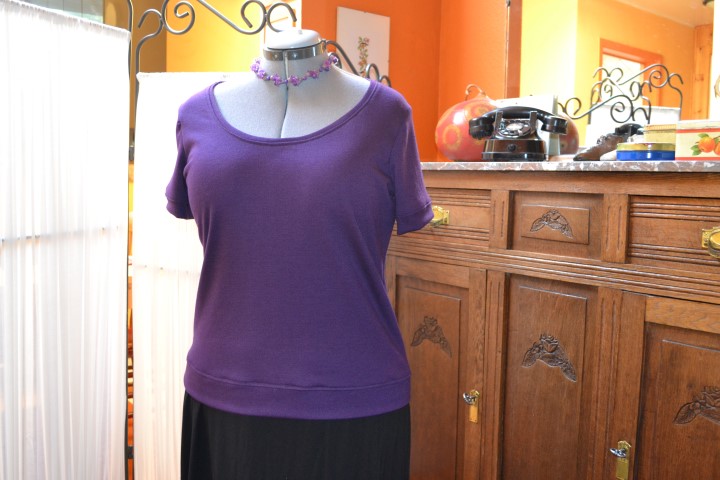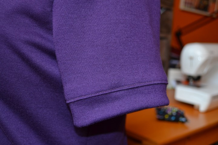 Hier combineerde ik de ronde hals met de korte mouwtjes, omdat ik een beetje moest puzzelen met de stof. Zo kwam het mooi uit, en ik had geen centimeter stof over!