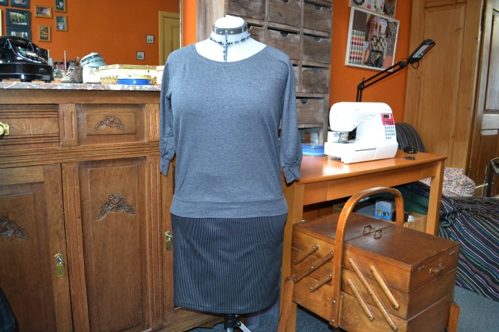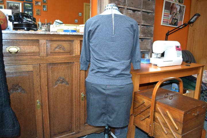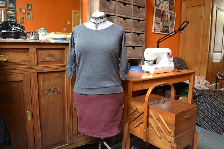 Ik had namelijk nóg zo’n stofje liggen met streepjes, zwart deze keer. En ook dat riep om een recht rokje. En dan was daar nog een mooi bordeaux stofje dat ik kreeg van Kristal van BAT, en dat riep ook om dat rokske. Bandwerk, ja, maar voor mij is het toch wel een fijn gevoel, het gevoel dat ik deze dingen nu echt meester ben. En het is ook mijn masterplan, eigenlijk, om een aantal patronen bij elkaar te zoeken waarvan ik content ben, met wat persoonlijke hacks, en goed op maat. En daar dan mee voort te doen. Want ik ga begot niet blijven patronen overtekenen!