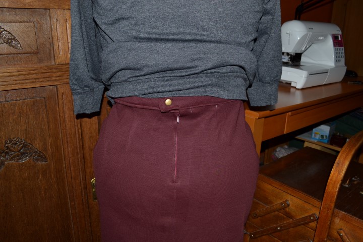 Het rood stofke was wat dikker, en daarbij heb ik behoorlijk gezweet op de lendenband. Uiteindelijk ziet die er langs de buitenkant heel behoorlijk uit, langs binnen is het ietske minder maar hey, who cares! Het is de binnenkant! Deze keer een goudkleurig kamsnapske (wegens geen ander kleur in mijn voorraad die ik erbij vond passen), en een zeer schoon passende bordeaux rits. Die ik ook weer probleemloos inzette.
