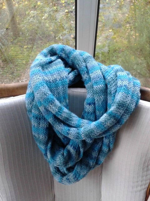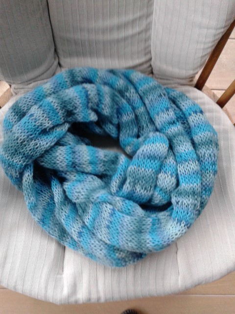 80 steken, naalddikte 7 waar normaal 3 goed zou zijn, dus heel los. Het gaat snel vooruit, en de sjaal wordt heel lang. Ik maak er een oneindige cirkel van, en zo kan je hem 3 tot 4 keer rond je nek slaan. Of een deel boven je hoofd trekken.