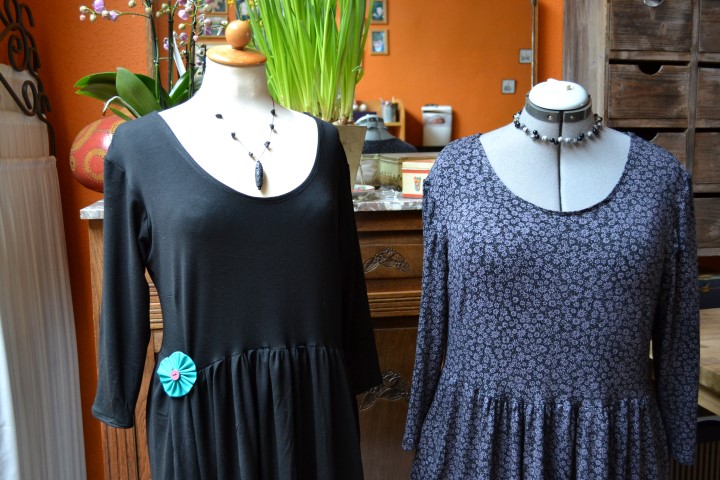 Voor beide dames had ik een stofje van stoffen.net: voor Lies zwart met grijze bloemetjes, voor Janna effen zwart, allebei tricot. Het ene stofje (dat van Lies) werkte al aangenamer dan het andere (dat van Janna). Van dat laatste is het rekpercentage (had ik het daar al eens over, onlangs) ook te groot, en het gaat wat te veel doorhangen naar mijn goesting.