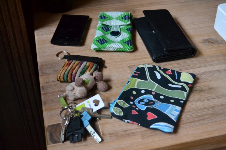 zijnde bovenaan van links naar rechts mijn telefoon, een zakje waar ik mijn telefoon zelden in steek (komt wellicht wel als ik weer met de fiets ga) en mijn portefeuille. In het midden een portemonneetje voor enkel geld, daaronder mijn sleutels, en rechtsonder een zakje met wat dingen (pillen tegen de hoofdpijn, kaartlezertje, kabeltje).