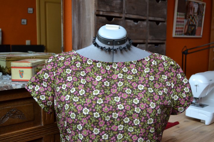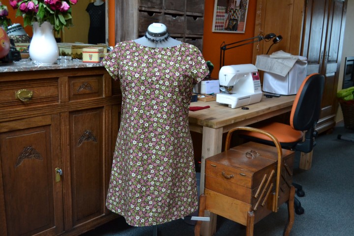 Eigenlijk is het poepsimpel, en ik had het jurkje dan ook op een halve dag af (patroon tekenen en stof knippen gebeurden al eerder in de week op een paar ochtenden). Het borduurt verder op kleedjes die ik al eerder maakte. Ik slaagde er wel nog in om er een mouw ondersteboven in te zetten (aaargh), maar dat was snel gefixt.
