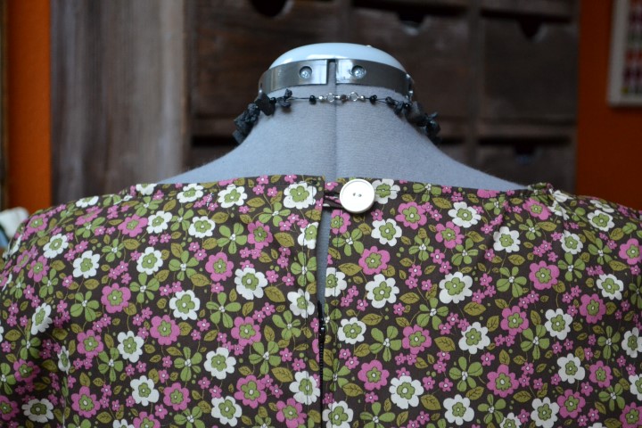 De afwerking achteraan vind ik heel leuk: een lange rits, maar daarboven een kort splitje met een lusje en een knoop. De rits had ik de dag ervoor net gekocht bij de kringwinkel (80 cent voor een rits van 60cm, koopje!) en een knoop vind ik altijd wel in mijn doos vol knopen.