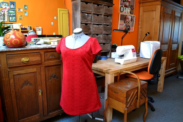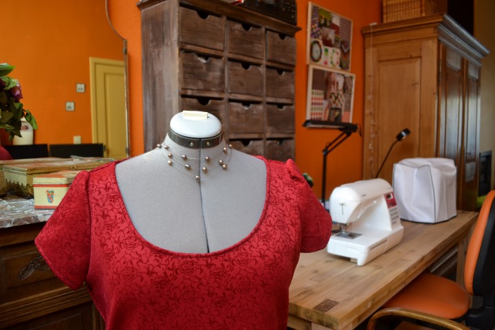 Voor ik me aan de stof van In den beer waagde, probeerde ik het patroon uit in een katoentje dat ik ooit kocht van Patricia. Ook heel mooie stof, maar katoen werkt op zijn minst een stuk makkelijker, en het patroon is ook geschikt voor stoffen die niet meerekken.