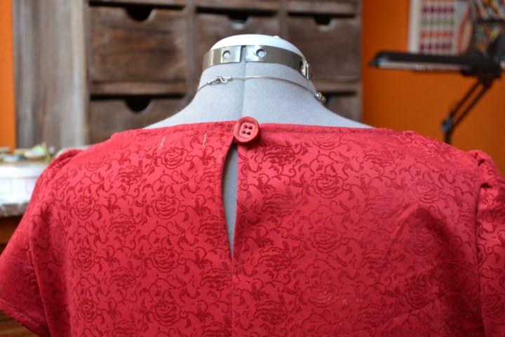 En omdat deze stof rekt, zette ik er geen rits in, enkel het splitje bovenaan met een knoop, wat ik altijd leuk vind.