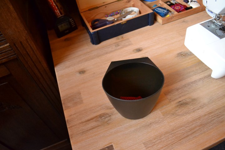 Ik heb een grote prullenmand onder mijn naaitafel, maar een afvalbakje op de tafel is ook heel handig. Altijd in de buurt om snel draadjes in te gooien, of kleine stukjes stof. Een gemak.