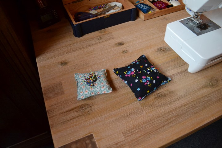 Speldenkussens ook in het meervoud, ja. Ook eentje voor bij de naaimachine, en eentje voor op de strijkplank. Nooit zoeken waar je het laatst je speldenkussen had. Je hebt mensen die zweren bij een magnetisch speldenkussen, je hebt mensen die een speldenkussen rond hun naaimachine hangen hebben, of rond hun pols, of die een potje gebruiken als speldenkussen… ik gebruik nog altijd het liefst een gewoon speldenkussen. Deze speldenkussentjes waren trouwens mijn eerste exploten op de naaimachine, een tijd geleden.