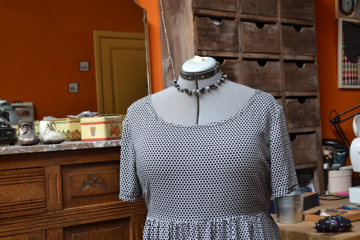 Ik gebruikte het patroon McCall’s M6923, en veranderde hier en daar wat. Ik maakte het lijfje korter, de korte mouwen ietsje langer. Wat allemaal netjes lukte.