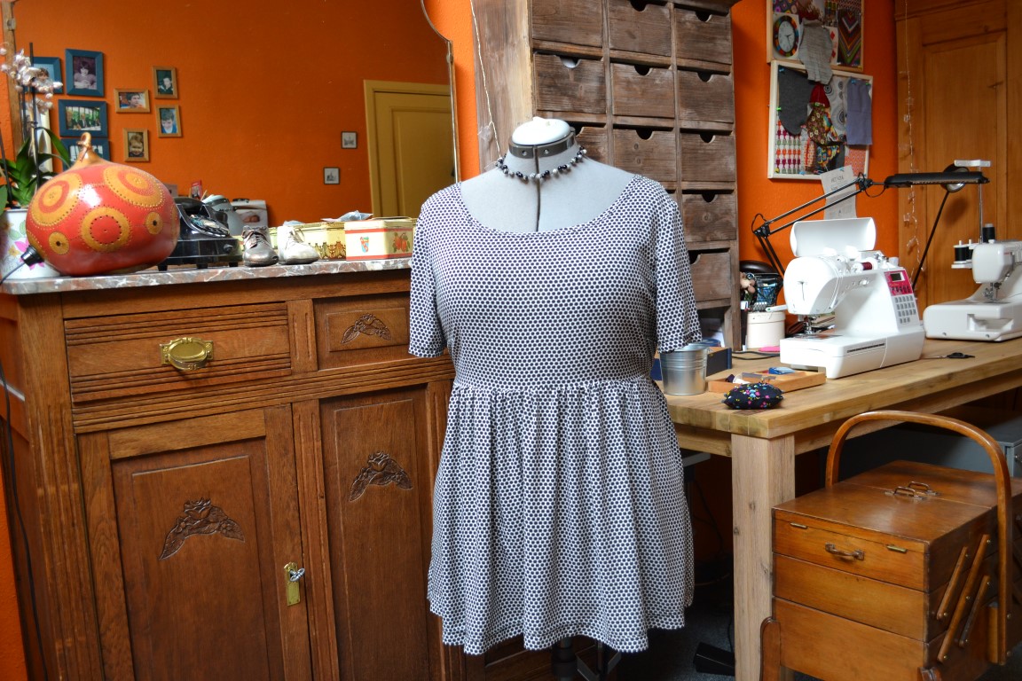 Wat ging er mis? Om één of andere onduidelijke reden was het voorpand langer dan het achterpand. Ik knipte een flinke reep van het voorpand af. Waarna het achterpand langer bleek te zijn dan het voorpand. Oei. Zo gaat het wel erg kort worden hè. Nog bijgeknipt, maar ik ben nog steeds niet tevreden, ik krijg het kleedje niet mooi recht. En waar de fout zit, ik kan er de vinger niet op leggen. Het ziet er altijd wel ergens scheef uit. De onderkant van het lijfje, vooraan, achteraan… grrrrr.