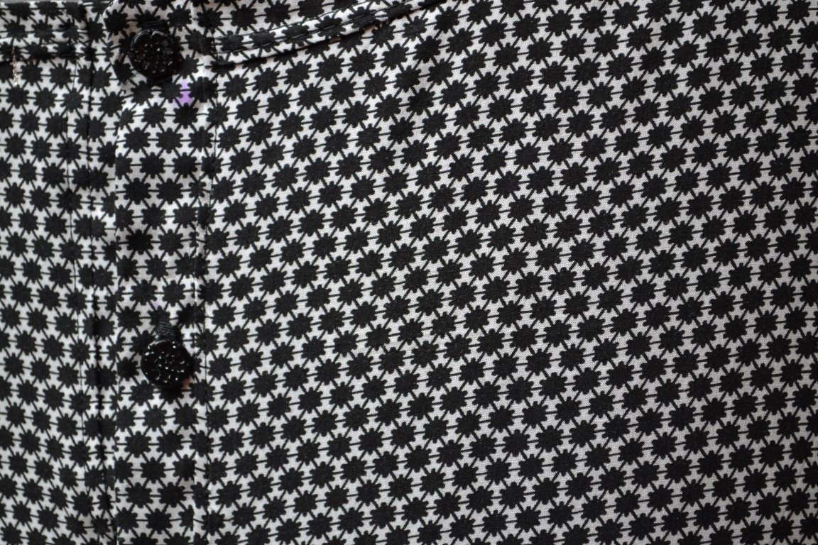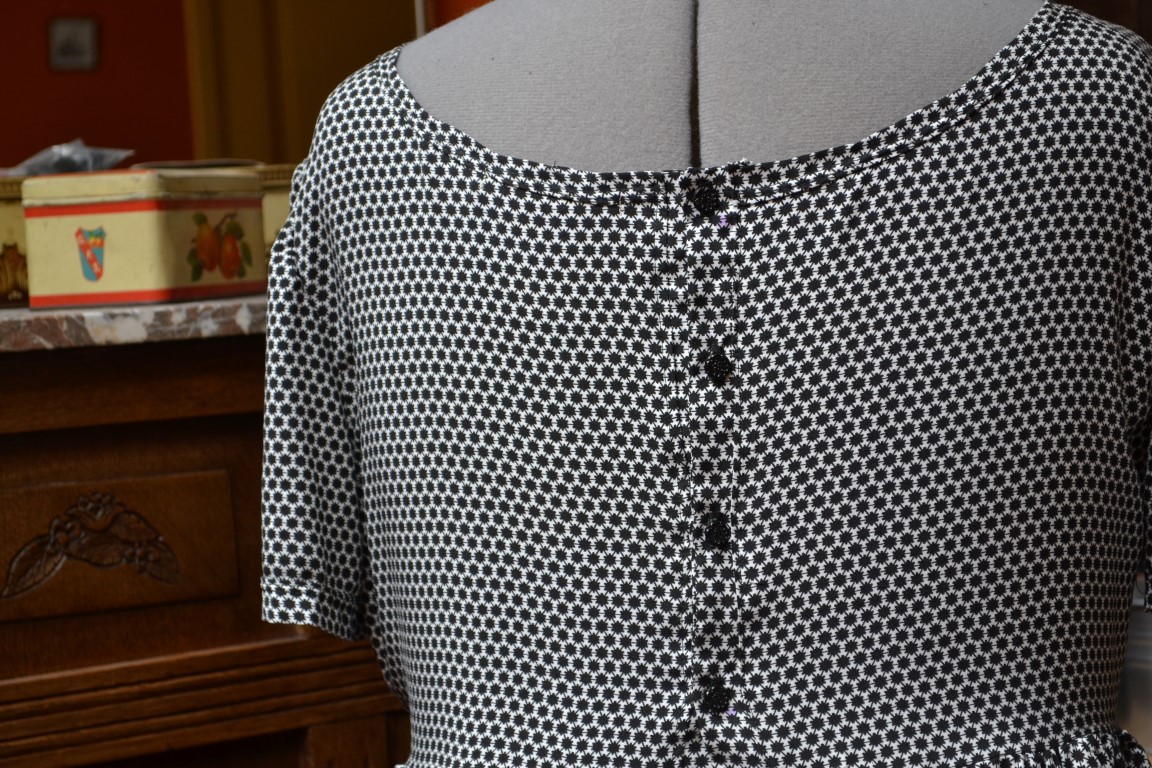 Het stofje was qua materiaal makkelijk om te verwerken, glad maar niet te glad, en alles bleef mooi op zijn plaats. Maar de bloemetjes hebben vaak geschemerd voor mijn ogen, en het is zo druk dat het moeilijk werd om ermee te werken.