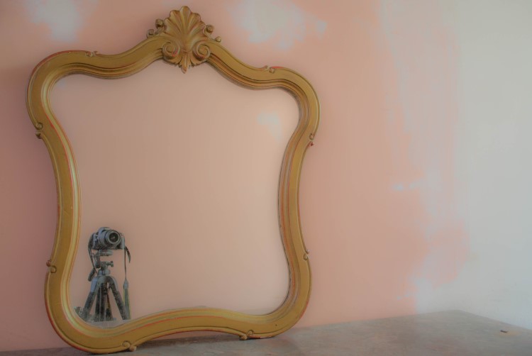 Op de kast staat de laatste kringloopaanwinst, een spiegel.
