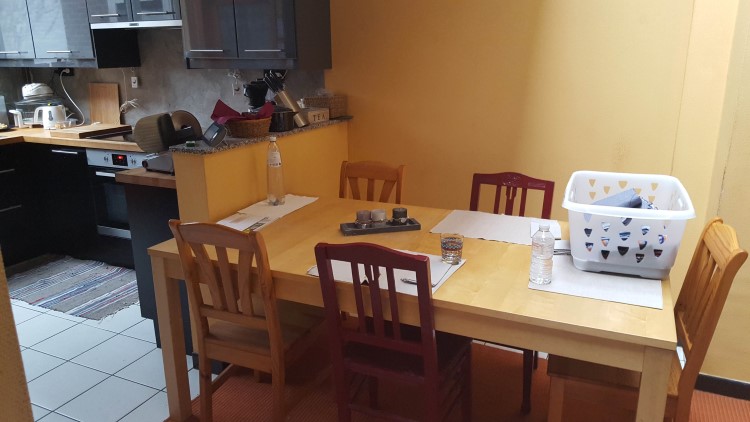 In de living staat momenteel een bed. Niet omdat er iemand ziek is, maar omdat we wachten op onze nieuwe zetels. Komt ooit wel in orde. Aan het raam is mijn naaiplek, daar heb ik het later wel eens uitgebreid over.
