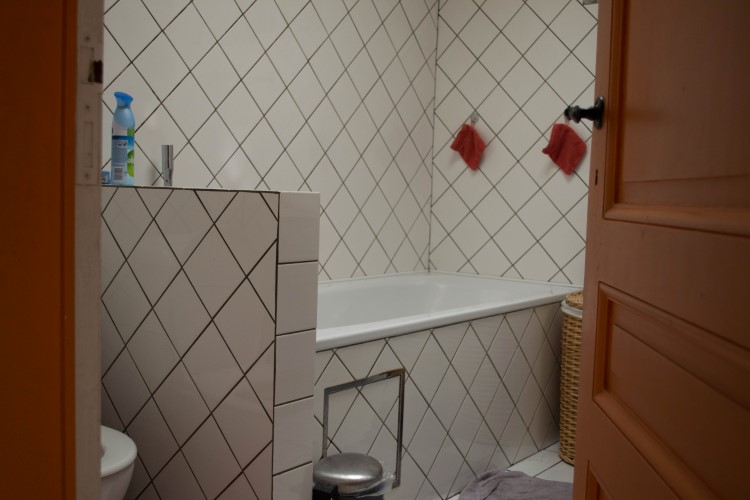 Badkamer. Toe aan vernieuwing. Maar dat zal nog efkes duren, want er zijn andere dingen nog toeter aan vernieuwing.
