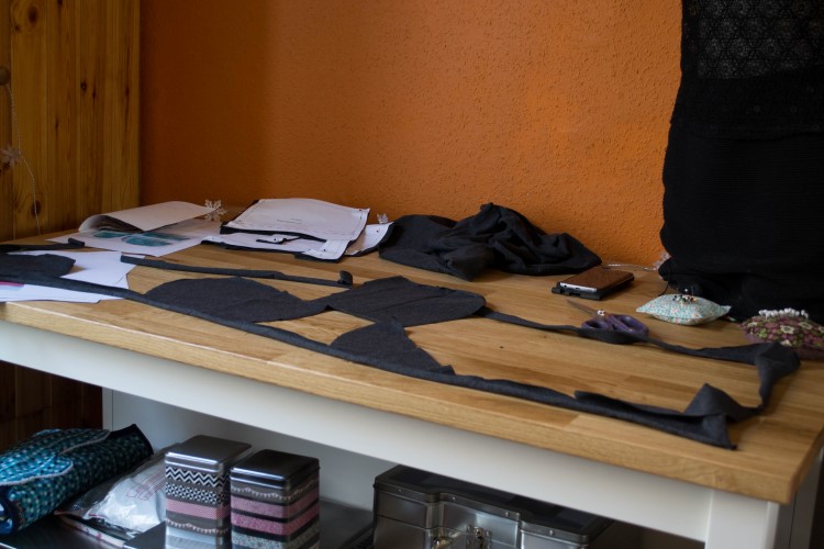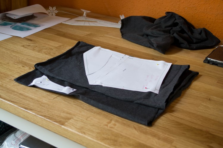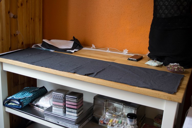 Dat is dus de breedte van mijn tafel (1m20 ongeveer) op een 40-tal cm, voor de maat Medium van een hipster patroontje (ik vond veel uitleg en het patroon op deze website). Ik gebruik het liefst stevige katoenjersey (dit hier is de overschot van een kleedje). Als je het een beetje handig aanpakt, geef het dit:
