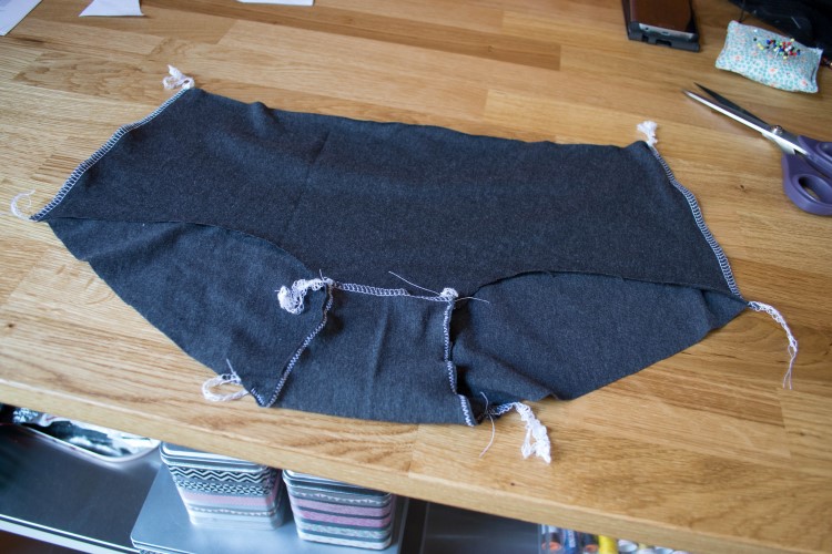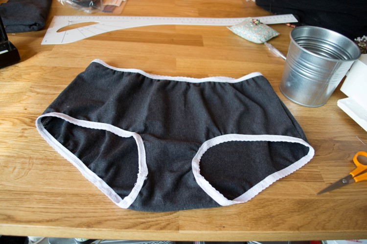 Waarna je de zijnaden van de onderbroek naait. (en waarbij slimme vergat een labeltje in te naaien, boehoehoehoe!)