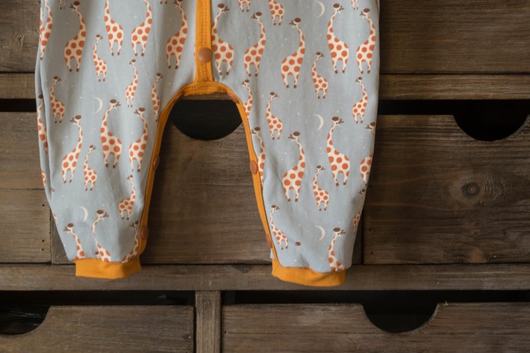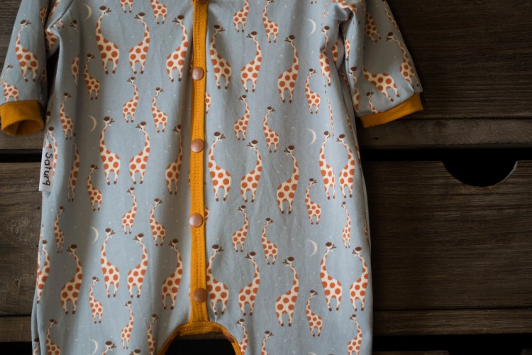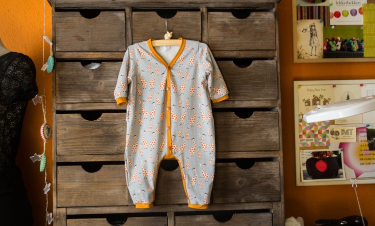 Eerst was de jumpsuit (onesie, pyjama) aan de beurt. Met een heerlijk mooi giraffenstofje. Ik had nog oranje tricot liggen waarin de boordjes perfect konden gemaakt worden. De kleur voor de knoopjes was een beetje zoeken (in echt oranje heb ik ze niet), Lies koos uiteindelijk voor de iets donkerder tint dan oranje.