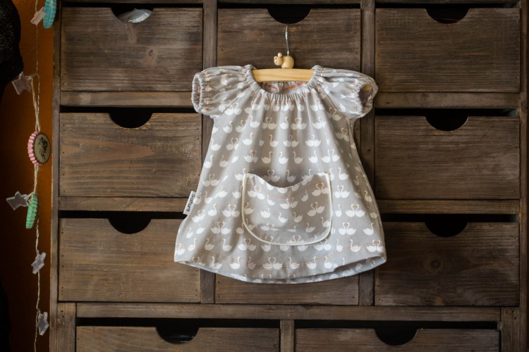 Dan volgde een kleedje, waarvan ik eerst een testversie maakte in een zot overschotje van stof die ik voor mezelf gebruikte (nog te zien op mijn instagram). Daaruit bleek dat het kleedje wat langer mocht. De mooie stof met de zwaantjes mocht eraan geloven.
