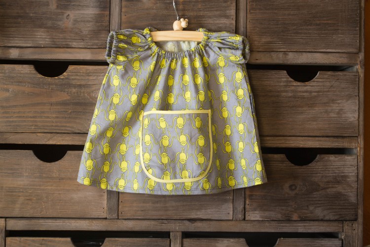 Ik maakte hetzelfde kleedje ook nog eens in het katoen met de aapjes. Dit maakte ik wat breder omdat het niet-rekbare stof is, en wat korter omdat ik het anders niet goed uit de stof kreeg. Het randje rond de zak is een biais-bandje dat ik vond ik de voorraad die ik kreeg van Andere Oma Nadine.