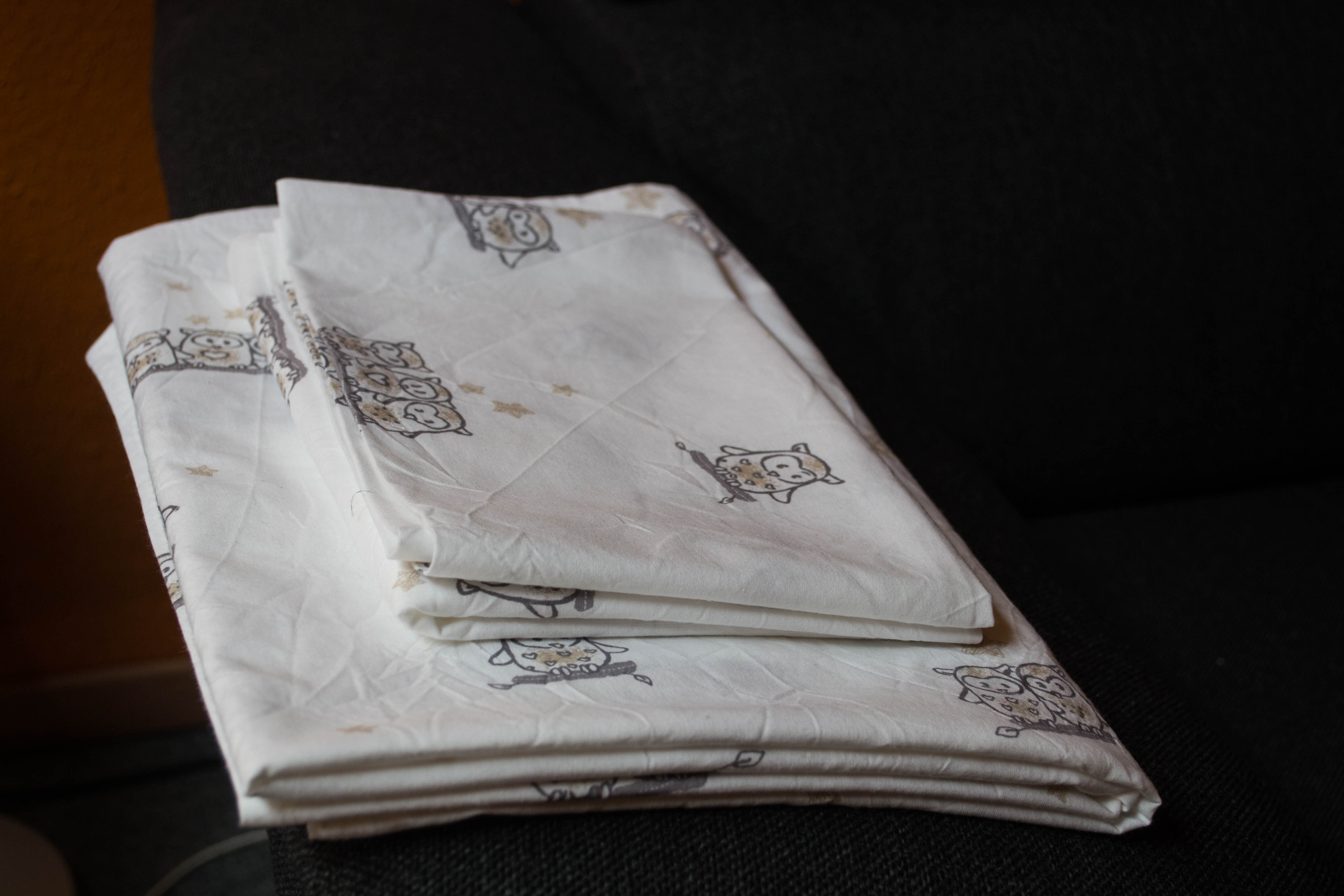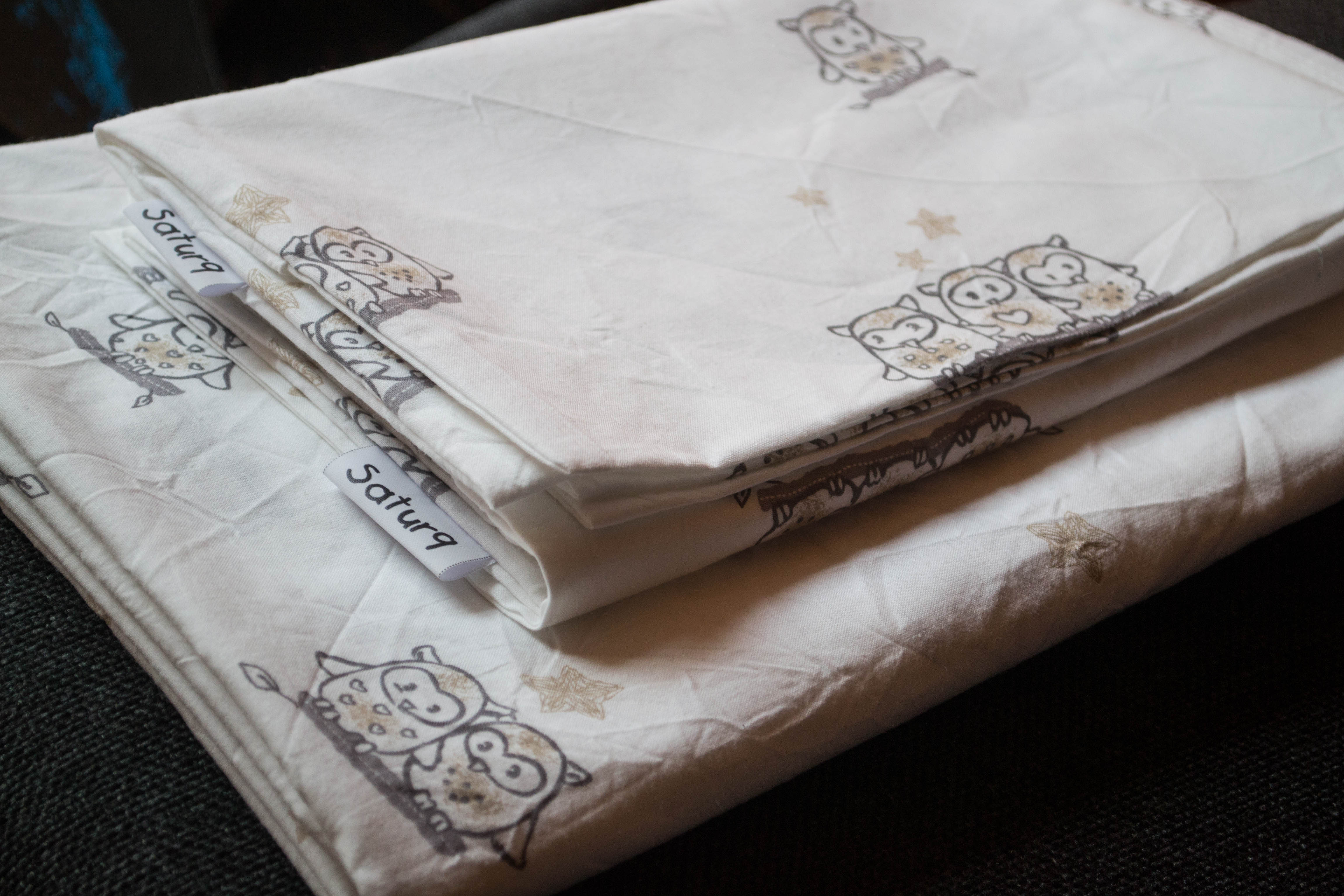 Bij In den beer zag ik een zalig katoentje met uiltjes. Ik maakte lakentjes, en bij een volgende bezoek kocht ik nog een lading van deze stof om lakentjes te maken voor als Lili hier eens komt logeren. (en die nog van pas zullen komen voor latere kleinkindjes ook, uiteraard)