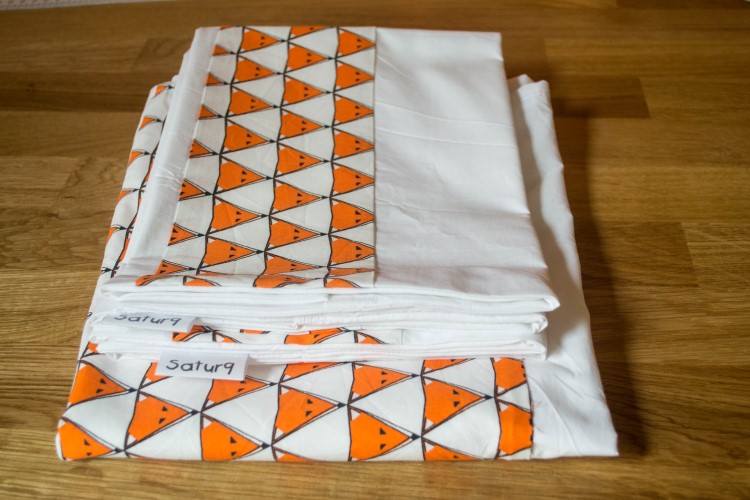 Bij stoffen.net kocht ik een reep katoen met vosjes, en samen met wit katoen maakte ik daar witte lakentjes van met een strookje vosjes.
