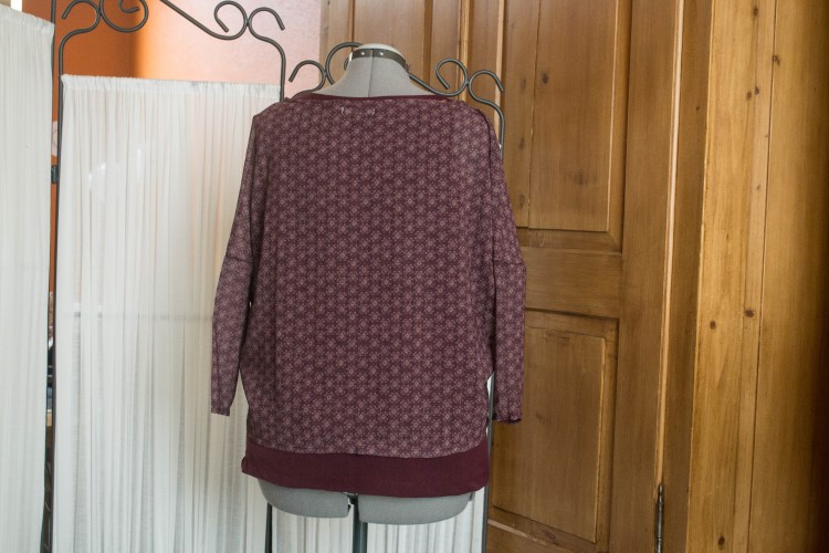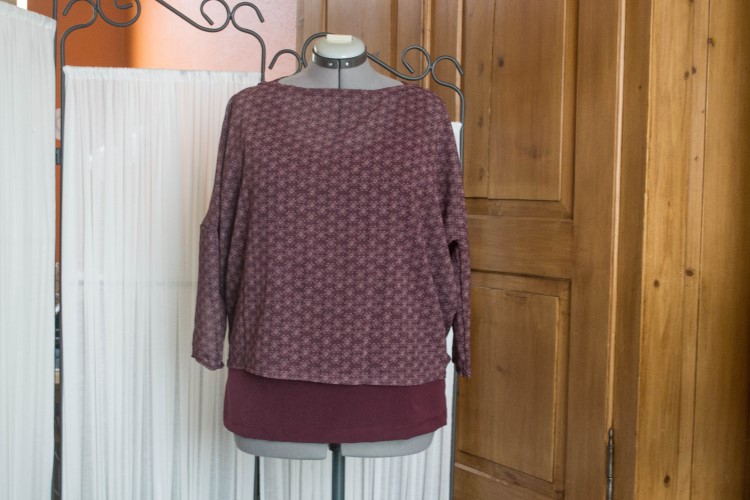 Bij een uitverkoop van Mon Depot kocht ik een tijd geleden een effen bordeau, licht rekbaar stofje. Op de tafels met afgeprijsde stoffen bij de Modecoupon vond ik een soort licht, doorzichtig crepe, ook bordeau, met bloemetjes. Beide stoffen lagen een tijdje geduldig in mijn schuif te wachten op inspiratie.