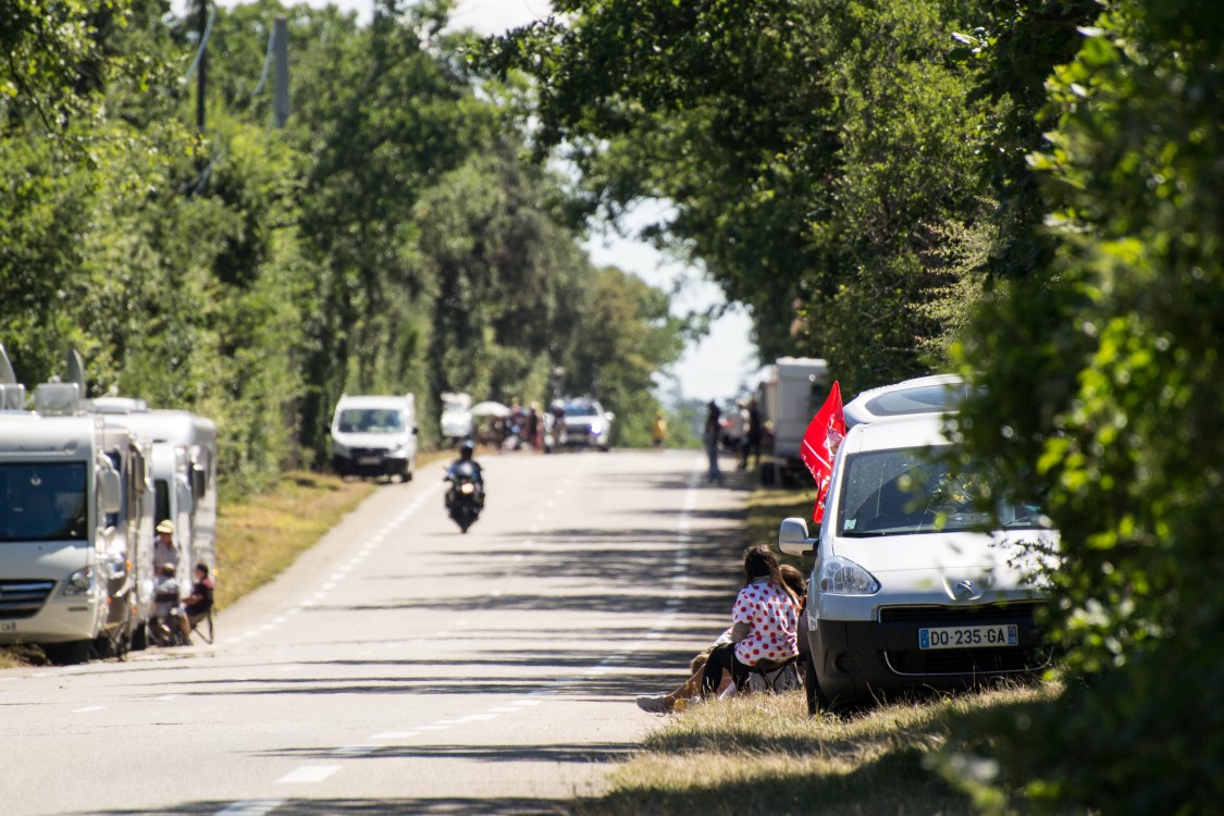 We genoten van brood en kaas (wat doe je anders, in Frankrijk?) en maakten ons op voor de volgende rit. Iets waar ik al heel lang al heel hard naar uitkeek: een tijdrit volgen! Kristal had voor ons heel veel verkenningswerk gedaan, en een route uitgestippeld om naar het parcours te rijden. Een prachtige rit werd dat, over en langs de Rhône, we hebben weer eens fantastische dingen gezien. Eerste plan was om naar Bidon te rijden (als je de Tour volgt, moet je op zijn minst eens in Bidon geweest zijn, toch?), maar op het laatst voerden we dat plan af en reden we naar Bourg-Saint-Andéol. Slecht idee, plannen op het laatste nippertje wijzigen: we raakten het stadje niet door. Podium opbouwen of vuurwerk? We weten het niet. We reden dan toch maar naar Bidon, wat vrij vlot ging. Daarna moesten we nog een stuk naar het parcours en daar gingen we even stressen: dat duurde en blééf duren, langs een pikdonker baantje in alweer het hol van Pluto (ze hebben er daar zo veel, in Frankrijk, holen van Pluto). Maar opeens, nadat ook ik de moed wat opgegeven had, kwamen we toch aan een kruispunt en zagen we campers. We zaten op het parcours.