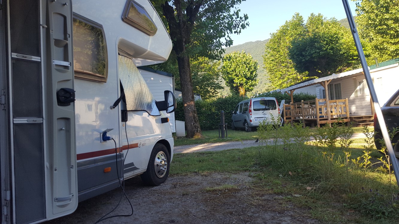 Wij dus met een bang hartje naar de camping. Dat lukte, ingecheckt, en met veel lawaai en stank naar ons plaatsje gereden. Het was daar gezellig en schaduwrijk, we installeerden ons en konden wat bekomen.