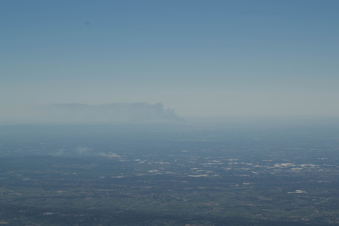 De uitzichten zijn mooi en wat nevelig vandaag. In de verte zie je de rookpluim van de bosbranden aan de Franse kust.