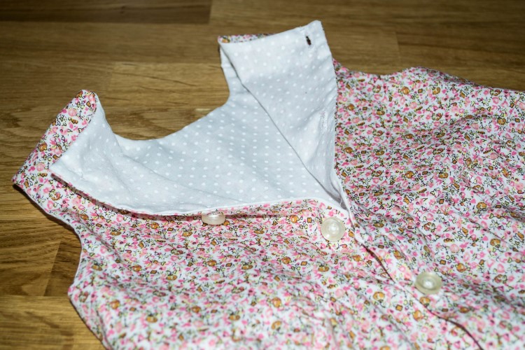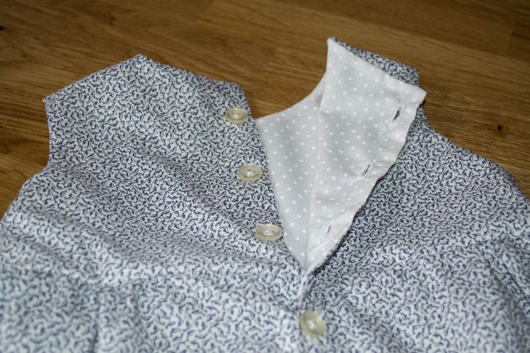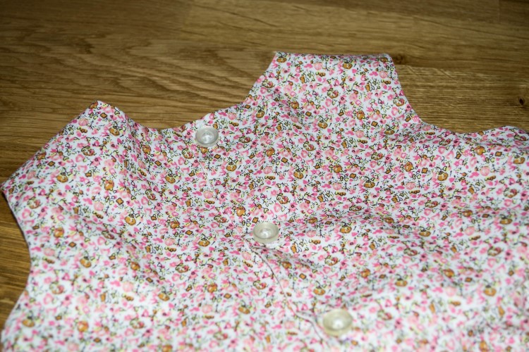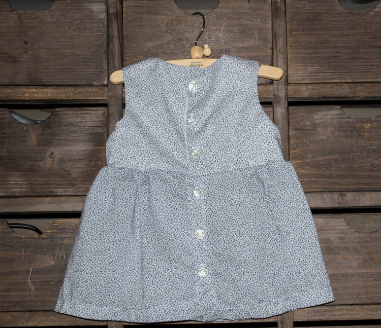 Het kleedje sluit achteraan met een rijtje knopen (ook al van Andere Oma Nadine). In katoen is er namelijk geen knoopsgatenhel en ga ik voor knoopjes. Lukte zonder ruzie met mijn naaimachine, behalve toen deze laatste besloot om bij het voorlaatste knoopsgat de stof op te eten.