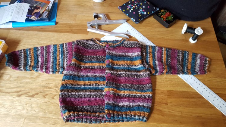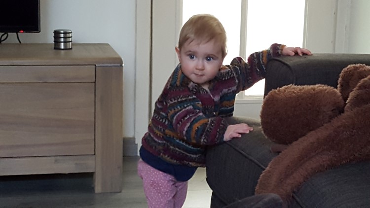 Een eerste versie breide ik in maat 18 maanden, 12 maanden durfde ik niet, omdat ik niet zeker was waar ik ging uitkomen, ik gebruik immers andere wol (*). Uiteindelijk is het vestje niet echt héél groot, dus ik ben blij dat ik geen 12 maand gebreid heb. Ik vergat er knoopsgaten in te maken, dus heb ik er kamsnapjes aangezet, dat gaat ook.