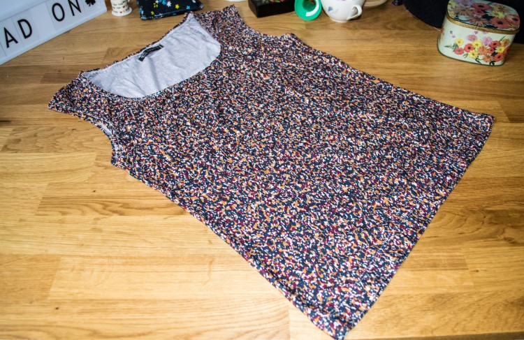 Het eerste moest een mouwloos shirt worden (een patroon dat ik zelf overtekende van een shirt uit mijn kast), niet genoeg stof voor mouwen. De schouders zijn vrij breed, en dat zie ik graag.