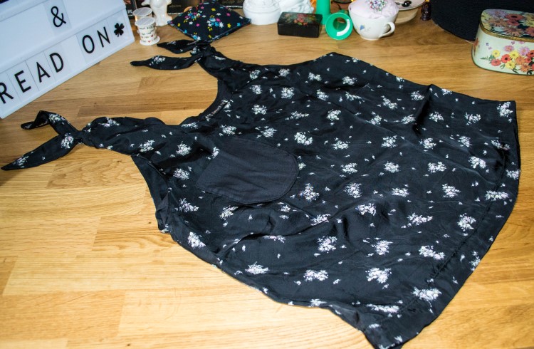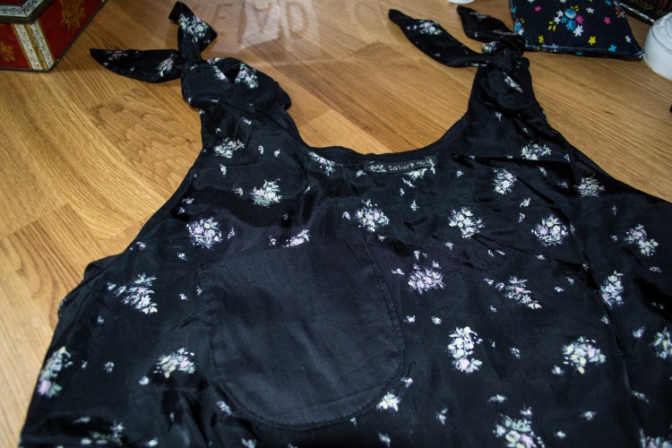Voor het volgende shirt gebruikte ik een nieuw patroon, de Gretta tank top van Seamwork. Een eenvoudig shirtje, met dichtgeknoopte schouders. Ik gebruikte er een stofje voor dat ik al lang met liefde bekeek als ik eens door mijn stoffen ging, zwart met bloemen, iets glibberig viscose-achtigs.