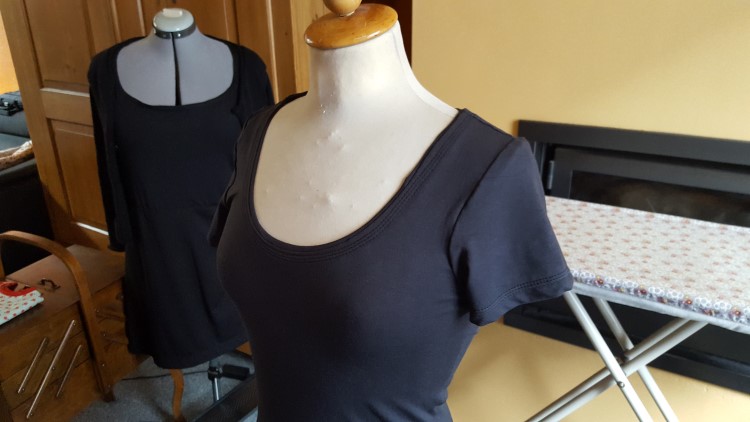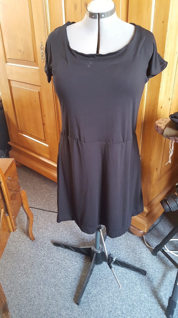 Volgende missie: een kleedje voor Janna. Ze had me een voorbeeld bezorgd waarop ik kon verderwerken. Ik tekende het lijf van het kleed over, en tekende er de bovenkant van het Deer & Doe Plantain shirt aan. Ze had mooie, antracietkleurige, dunne tricot gekocht in de uitverkoop rayon van de Modecoupon. Na mijn ervaringen met mijn eigen kleedje was ik een beetje bang dat het ellende zou geven met dat dunne tricot, maar het viel best wel mee. Na het gesukkel met het beleg, koos ik hier voor een simpel boordje, en dat viel heel mooi uit. Janna heel tevreden, en ik ook.
