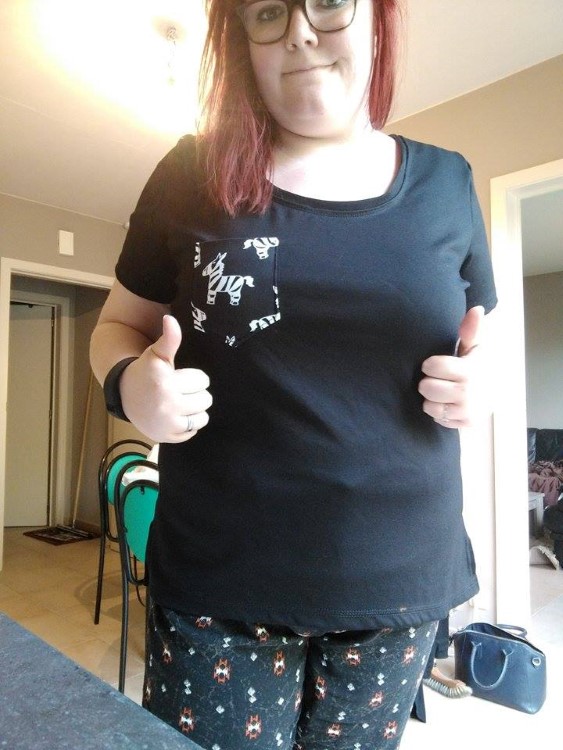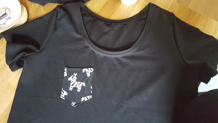 Daarna begon ik aan een shirt voor Sara. Sara vroeg of ik voor haar verjaardag een shirt met een zebra-zakje wilde maken, en dan zeg ik natuurlijk niet neen. Ik tekende eerst het Deer & Doe Plantain shirt over, maar na vergelijking met een shirt van Sara, vond ik dat patroon niet goed. Ik switchte naar het Rio patroon van SeamWork, en dat vond ik wel OK. Sara zag de split en langere achterkant wel zitten. Eerste poging: hm, ze hebben me toch niet echt de gevraagde hoeveelheid stof gegeven bij de Modecoupon, ik krijg het shirt er niet uit. OK dan. Na enig overleg online opnieuw besteld, waarna ik toch vrij snel weer aan de slag kon. Weinig over te melden, het naaien ging zeer vlot, ik ben tevreden met het resultaat, en Sara ook. Ik heb nu een goed patroon als ik eens iets wil maken voor haar, een volgende shirt mag misschien wel wat korter maar voor de rest is het heel goed.