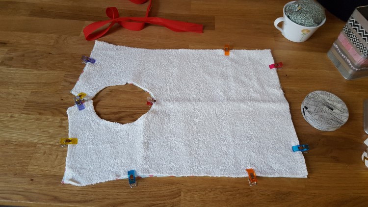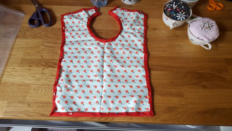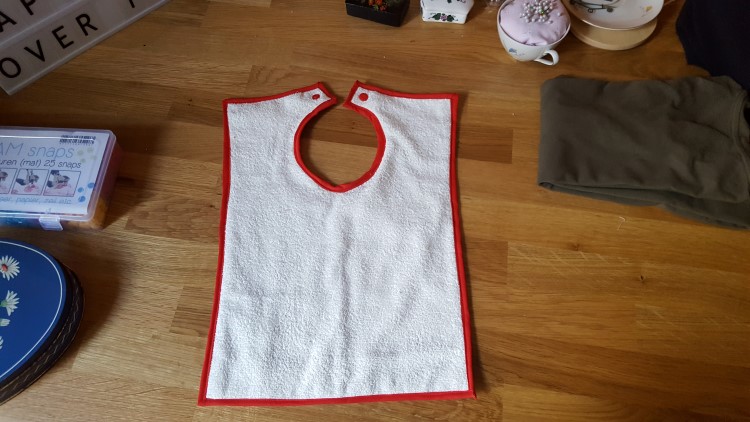 Werd ook nog gemaakt: een bavet voor Lili. Van Oma-Oma kreeg ik iets als dunne toile-cirée van bij de Veritas (mooi!), ik tekende zelf een patroontje, had zelf nog mooie crèmekleurige badstof liggen, en biais zou ik kopen bij de Modecoupon. Alwaar ze geen mintkleurige biais hadden, meh. Ik kocht andere groene biais, die qua kleur eigenlijk niet zo goed bleek te passen, en waarvan bleek dat, belangrijker nog, 1,5m niet voldoende was?!? Meh again. Dan maar rode biais besteld (samen met de stof voor Sara haar shirt), een beetje meer, en uiteindelijk was het in orde. Het toile-cirée achtige stofje naaide erg moeilijk en ik ben nog steeds geen held met biais, ergo de bavet zit vol fouten, maar als je niet te dicht kijkt, is het wel een leuk ding.